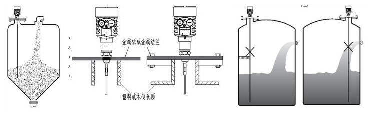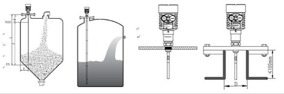 安裝指南適用于纜式和桿式探頭測(cè)量固體粉料和液體物體。同軸管式探頭只適用于液體物體。